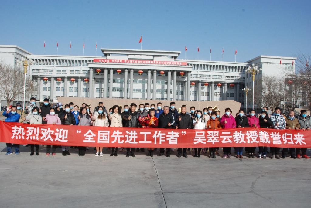 11月27日中午,塔里木大学在学校正南门前举行仪式热烈欢迎“全国先进工作者”吴翠云教授载誉归来。