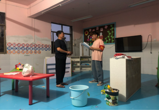 在统计当地一所幼儿园受灾情况时,我积极帮助他们做灾后修复工作。在一起干活虽然很累、很辛苦,但是能够帮助到他人,我的内心开心而满足。清理垃圾时杂物被水侵泡后腐臭难闻,在没有工具的情况下,我和其他志愿者用手清理,使得排水系统得以畅通。