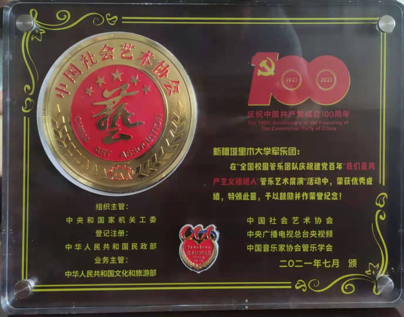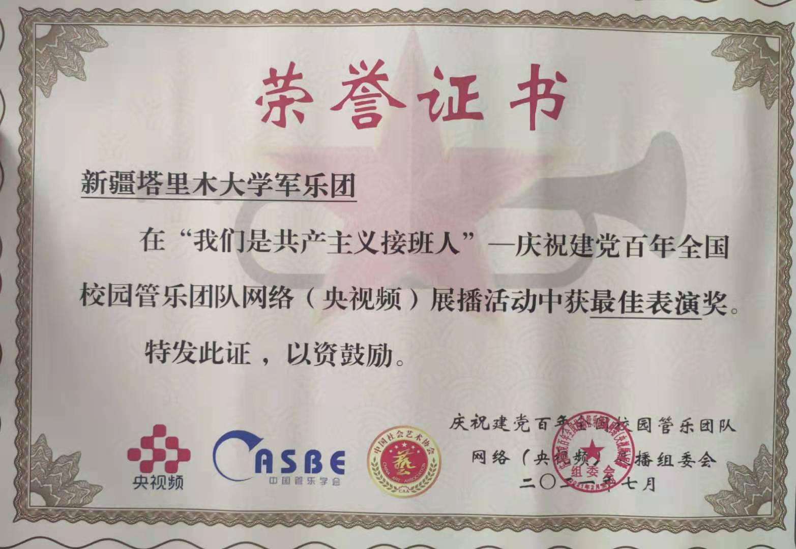 近日,为庆祝中国共产党百年华诞,由中国社会艺术协会、中央广播电视总台央视频、中国音乐家协会管乐学会联合举办的“我们是共产主义接班人”——庆祝建党百年全国校园管乐团队网络(央视频)展播活动圆满结束,我校军乐团演奏的作品《没有共产党就没有新中国》经过层层选拔与大众投票,最终荣获 “最佳表演奖”,是新疆大中小学当中唯一获此荣誉的管乐团。