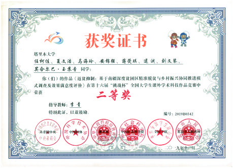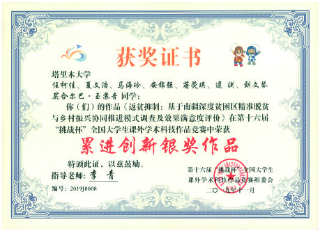 在学校、学院、部门各级领导的大力支持下,2016年“创青春”中航工业全国大学生创业大赛第十届“挑战杯”大学生创业计划竞赛荣获铜奖4项。2017年第十五届“挑战杯”全国大学生课外学术科技作品竞赛中《“精准扶贫”典型、经验与贫困户满意度调查研究-基于南疆少数民族集中连片特困区》荣获特等奖1项,三等奖3项。2018年“创青春”大学生创业大赛获全国银奖1项、铜奖3项。授予我校“服务新疆民族地区三农”创新团队“小平科技创新团队”称号。2019年第十六届“挑战杯”全国大学生课外学术科技作品竞赛中荣获累进创新银奖1项,二等奖1项,三等奖3项。2020年成功举办第三届“创青春”大学生创业大赛,金奖7个,银奖 12 个,铜奖 16个。在第十二届“挑战杯”大学生创业计划竞赛中荣获银奖2项,铜奖2项。第六届兵团“互联网+”大学生创新创业大赛中荣获一等奖1项,二等奖1项,三等奖1项。第六届中国国际“互联网+”大学生创新创业大赛全国总决赛首获银奖1项。