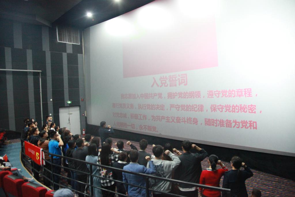 雷长柱带领全院师生党员重温入党誓词。随后,大家共同观看了电影《我和我祖国》,电影分别由“前夜”、“相遇”、“夺冠”、“回归”、“北京你好”、“白昼流星”、“护航”七个单元构成。在片尾时,大家纷纷挥动手中的小红旗,热烈庆祝新中国成立70周年。