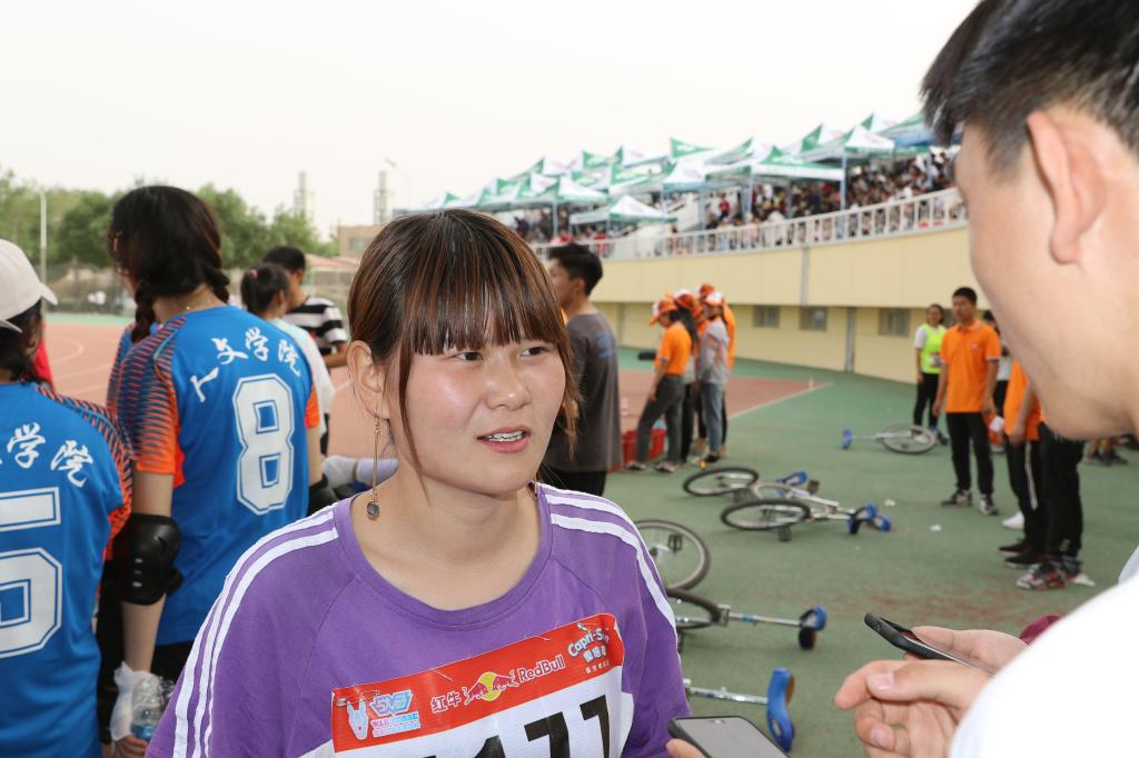 在问到学习独轮车的经历,他说:“我在大一时就开始学独轮车,虽然有些困难,但一直没有放弃,因为选择了一条路,就要一直走下去。”说到今后的打算,他说要尽自己最大的努力去参加后面的比赛,他除了独轮车8000米外,还报了独轮车1500米、4×100米接力和5000米马拉松。