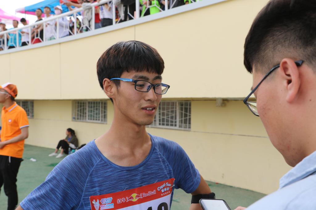 当记者问到他冲线的感觉时,他说冲线的那一刻想法不是很多,但是当下来之后看到自己是第一名很激动。特别是听到同学们的加油声,心里很舒服、很感动,因为毕竟身后有着强大学院在支持着。说到这里,这个九零后大男孩露出了笑容。