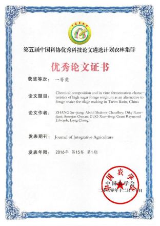 我校动物科学学院张苏江教授为第一作者,郭雪峰教授等人为共同作者的论文《Chemical composition and in vitro fermentation characteristics of high sugar forage sorghum as an alternative to forage maize for silage making in Tarim Basin, China》入选荣获“第五届中国科协优秀科技论文遴选计划”农林集群优秀论文一等奖。塔里木大学动物科学学院为第一作者单位。