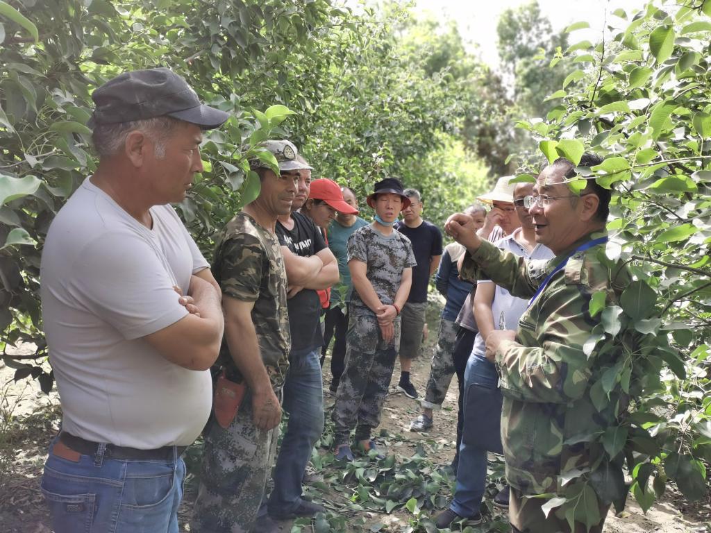 眼下正值梨树夏季管理黄金期,为切实发挥科技特派员科技兴梨、强梨作用,助推乡村振兴战略实施,2020年6月5日-7日,我校“香梨提质增效”兵团科技特派员服务团队张琦教授、包建平副教授对第三师53团20连、21连、22连和良种连的主干形香梨进行夏季修剪、果实膨大、花芽分化期水肥管理、果园自然生草覆盖和香梨枝枯病预防等工作开展培训服务。