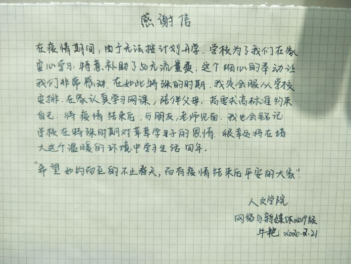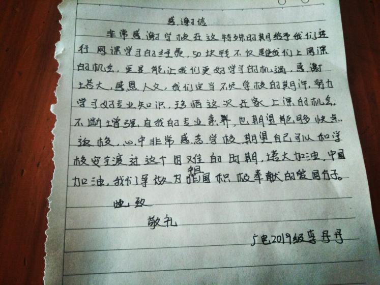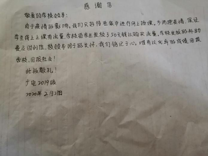 机电工程2019级4班牛江云同学说:“隔离病毒不隔离爱,尽管我们只能宅在家里,学校仍没有忘记每个学生,惦记着学生的学业情况,给上网课的我们,提供流量补贴,减轻家庭压力。我会更努力地学习,把这份爱心传递下去。”