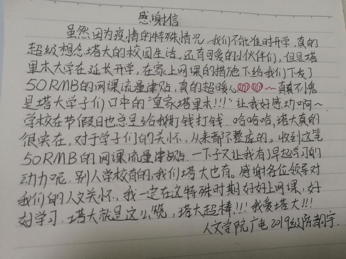 广电2019级李丹丹说:“非常感谢学校在这特殊的时期给予我们进行网课学习的经费补贴,50块钱不仅是我们上网课的机会,更是能让我们更好学习的机遇,感谢塔大,感恩学校。我们定当不负学校的期许,努力学习好专业知识,珍惜这次在家上课的机会,不断增强自我的专业素养。也希望能够快点儿返校,期望自己可以和学校安全度过这个困难的时期,塔大加油!中国加油!”