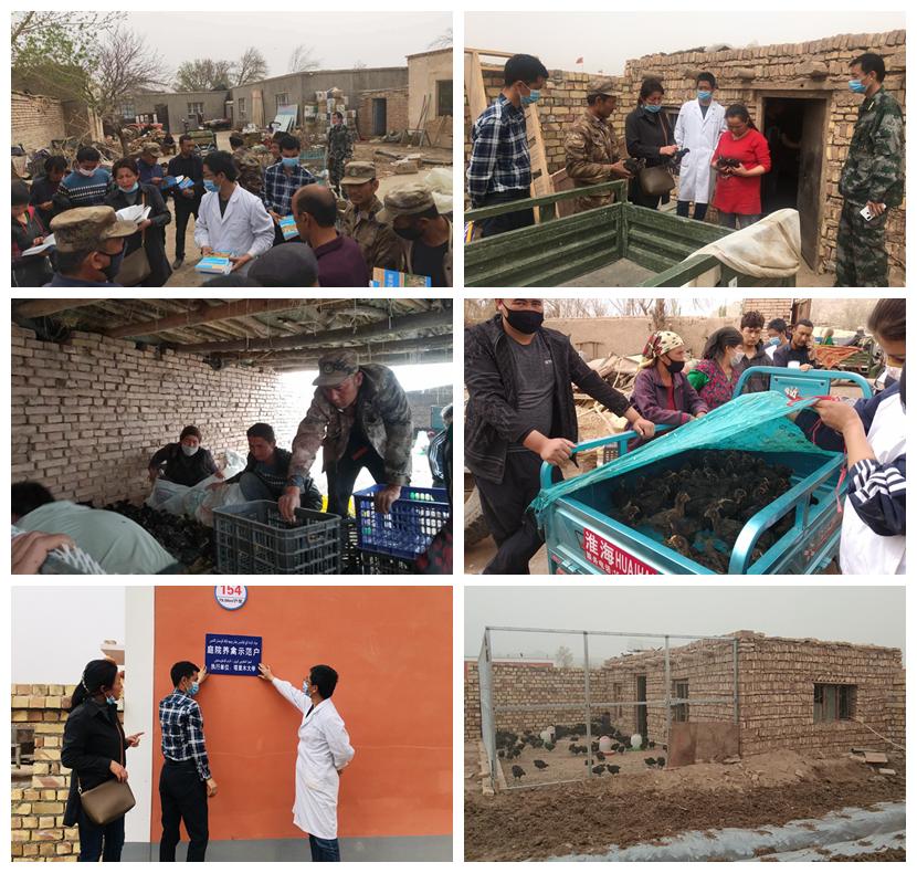 该扶贫项目开展以来,团队成员深入贯彻精准扶贫各项决策部署,加大产业扶贫力度。4月3日团队来到第三师51团4连对当地实际情况进行调研和了解贫困户实际情况,制定了因地制宜的帮扶方案。4月10日再次来到第三师51团4连,为建档立卡贫困户和其他有意愿养鸡的农民共31户,贫困边缘户30户,用扶贫资金免费发放团队培育的10000只30日龄黑羽肉鸡,并免费给31个贫困户发放铁丝网护栏,为51团4连贫困户庭院养鸡,尽快脱贫致富提供帮助。