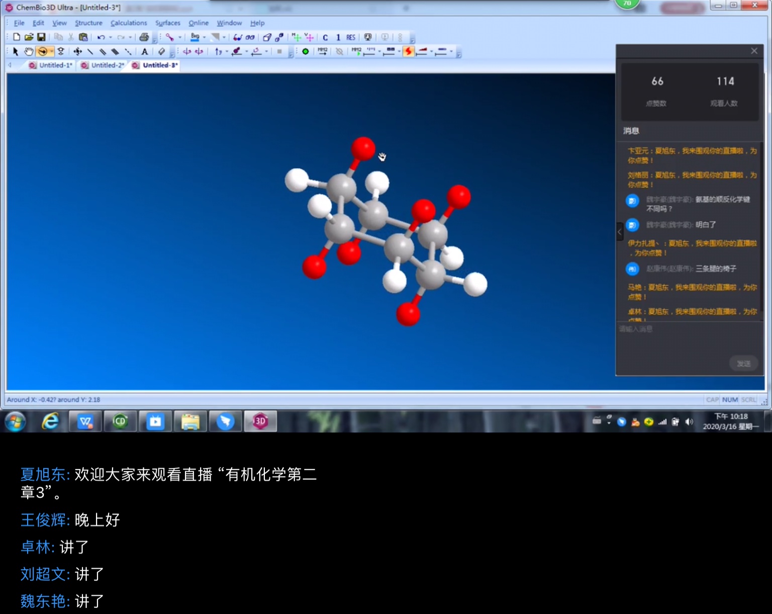 为确保网上授课效果不减,针对由于有机化合物种类繁多、组成复杂,结构多变,学生难以掌握,听课提不起兴趣问题,他调整传统的教学设计,在课堂中引入了ChemDraw专业软件。每讲到一种新的有机物时,他都现场画出来讲解、展示。在这种直观的画法教学中,夏旭东老师的网课效果得到了学生普遍认可。