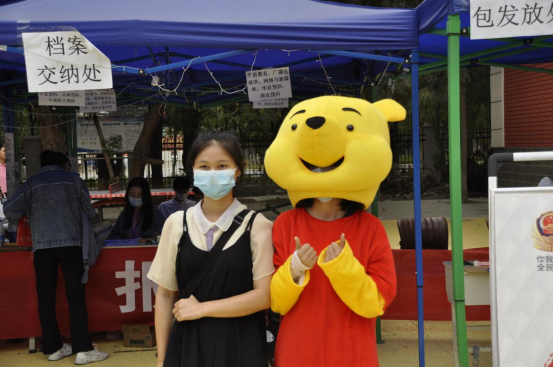 第四站:欢迎入住你的新家。宿舍楼前,标语、宣传墙、卡通玩偶、拍照板……特色鲜明的迎新宣传彰显学院风采,打造温馨家园。