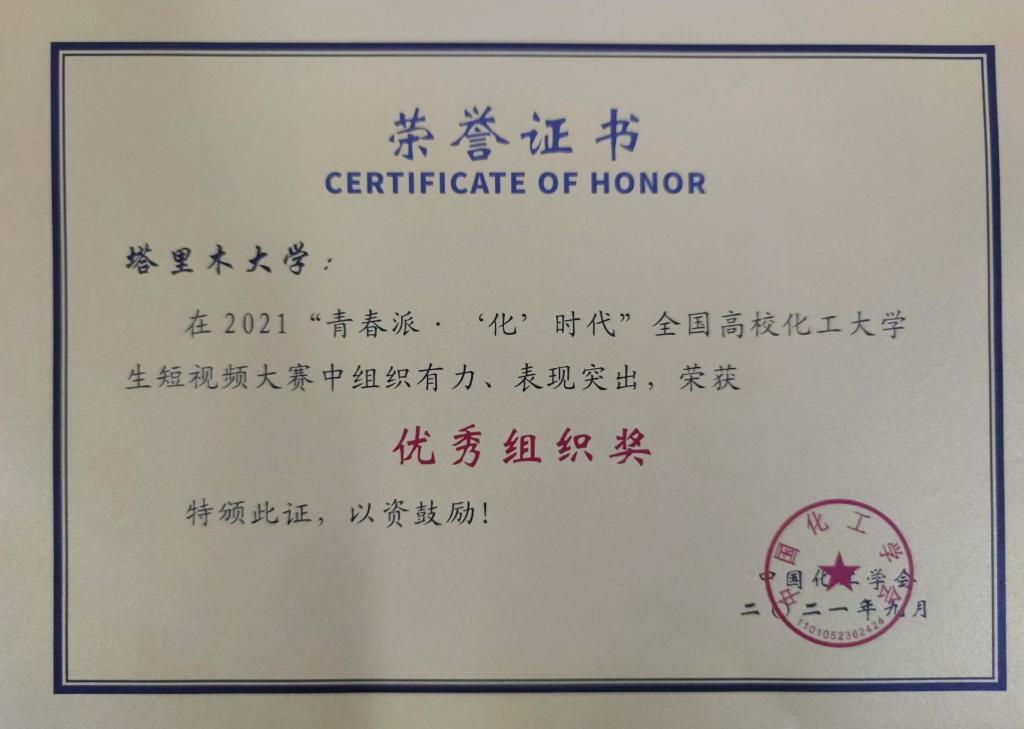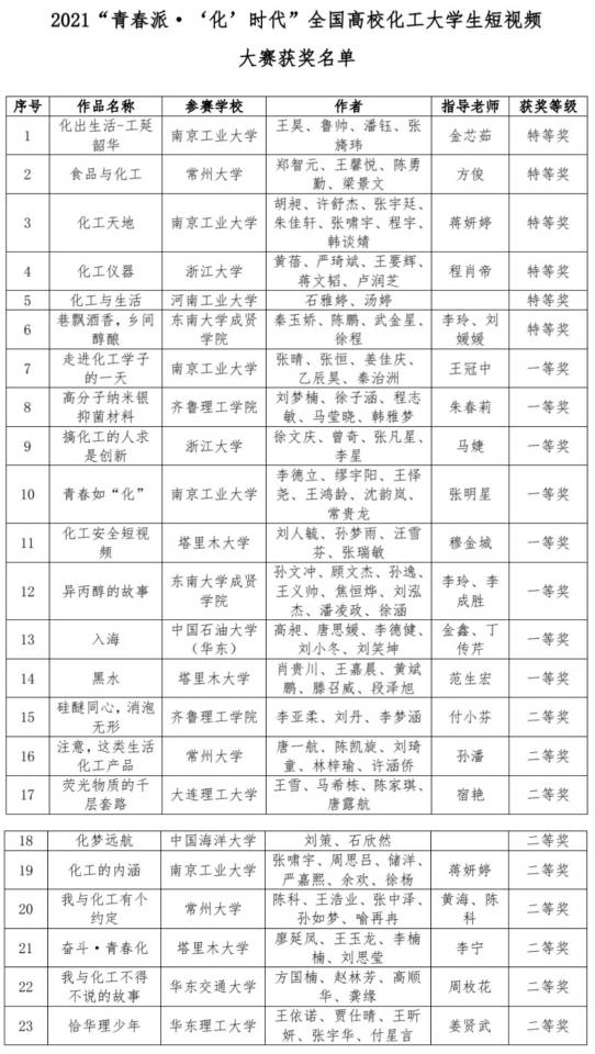 近日,由中国化工学会主办、南京工业大学承办的2021“青春派•‘化’时代”全国高校化工大学生短视频大赛评审结果公示。经过专家初评、投票、综合评审等环节,共评选出获奖作品23项,其中特等奖6项、一等奖8项、二等奖9项。浙江大学、南京工业大学、常州大学、塔里木大学、齐鲁理工学院、东南大学成贤学院荣获优秀组织奖。我校参赛作品《黑水》《化工安全短视频》分获一等奖,《奋斗·青春化》荣获二等奖。
