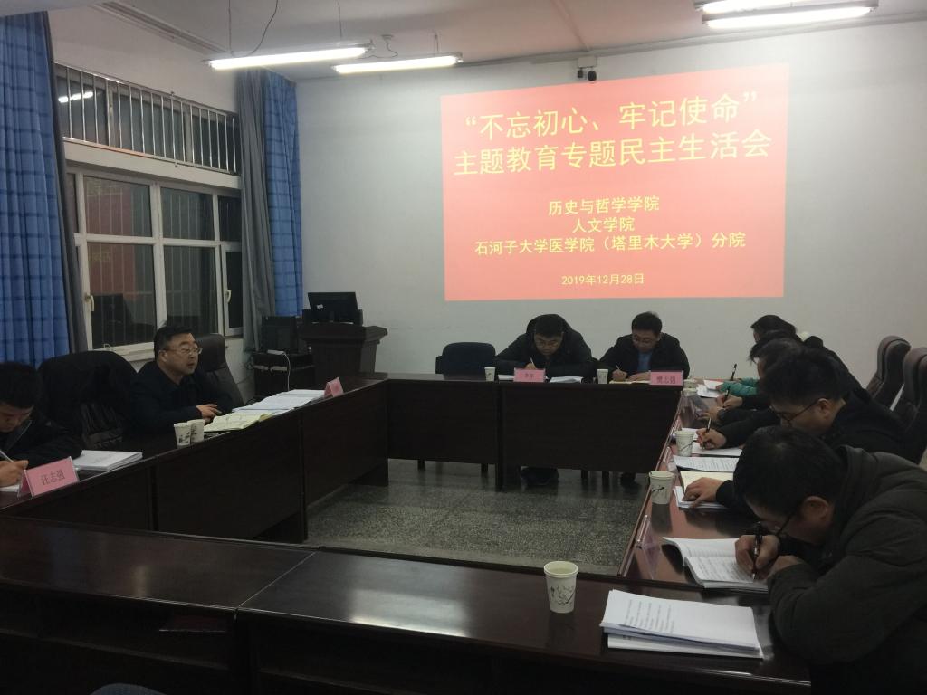 根据学校党委关于“不忘初心、牢记使命”主题教育部署要求,12月28日下午,历史与哲学学院、人文学院、石河子大学医学院(塔里木大学)分院三个学院党委(党总支)领导班子召开“不忘初心、牢记使命”主题教育专题民主生活会。学校主题教育领导小组第一指导组组长张理、成员汪志强,三个学院(党委)党总支领导班子成员参加。三个学院党总支委员、主题教育办成员列席。会议由校长助理、历史与哲学学院党总支书记、院长万朝林主持,在1号楼216会议室召开。