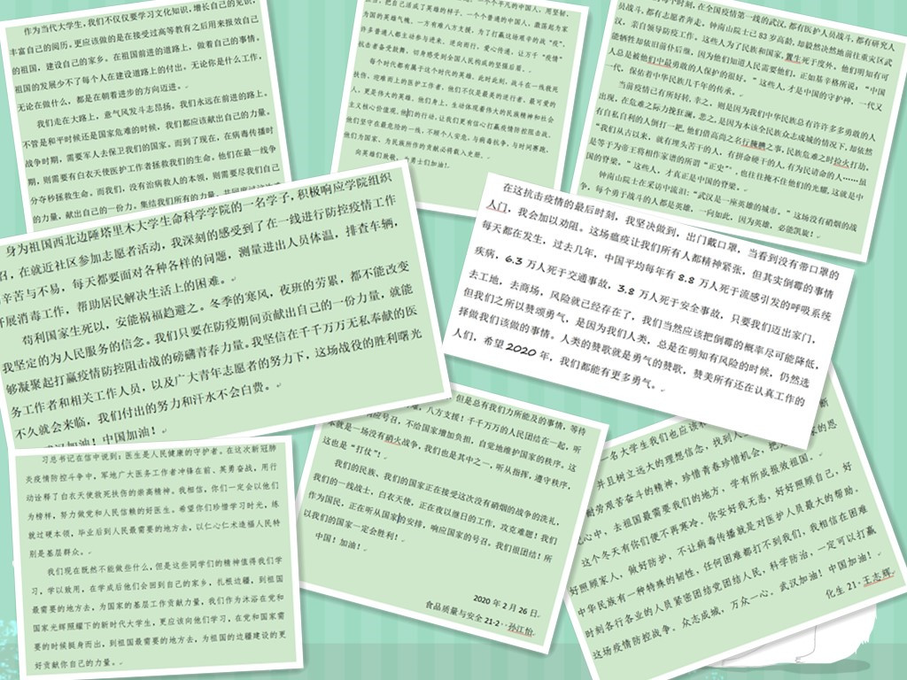 食科2018级1班的艾力亚尔江·努尔尼牙孜说:“生命之美,在于奉献。2020年的春天,我看到了医务人员不分昼夜的战斗,村干部们走街串巷的呼唤,老师们孜孜不倦的奉献,感谢你们让我体会到源自生命的感动!”
