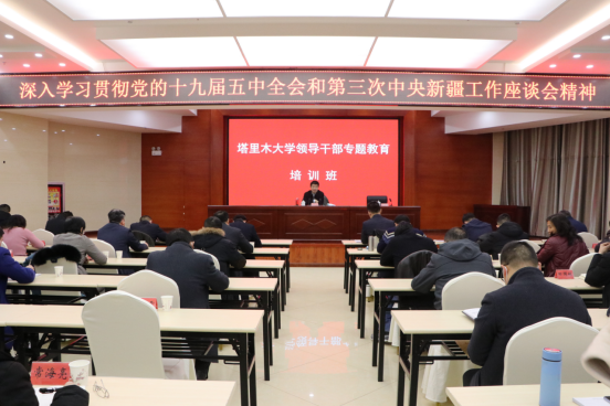1月11日上午,党委书记赵光辉为学校“深入学习贯彻党的十九届五中全会和第三次中央新疆工作座谈会精神”专题教育培训班作讲座。讲座由党委常委、组织部部长马智群主持,在南疆双语中心二楼会议厅举行。