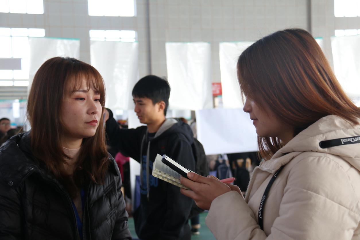 招聘会上,毕业生探寻自己的“伯乐”,企业也纷纷寻找“千里马”。在各个企业展位前,毕业生们很早就有序排起了长队,每个招聘桌上都放着厚厚的一沓简历。