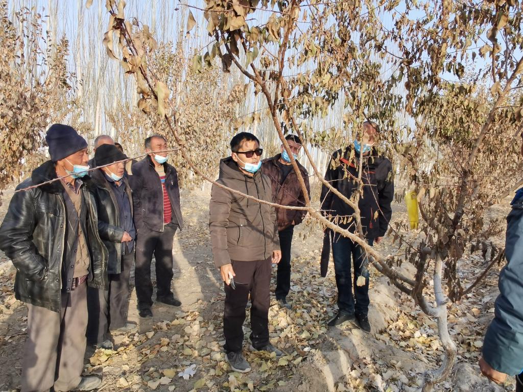 王振磊、焦海宏副教授在吐格其村,分别针对杏树冬季管理和牛皮肤病防治进行现场培训。