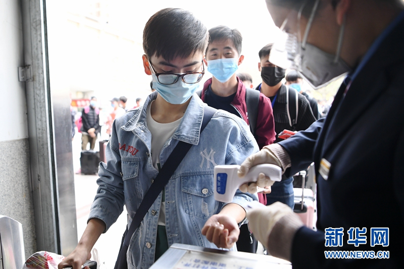 4月17日,塔里木大学的学生在兰州火车站进站口测温后进站。新华社记者 陈斌 摄