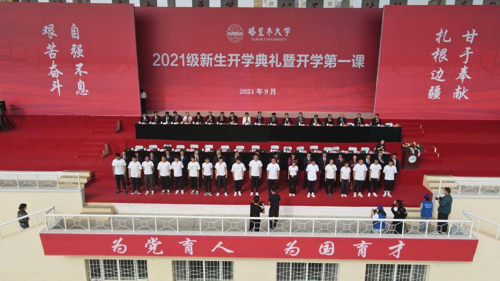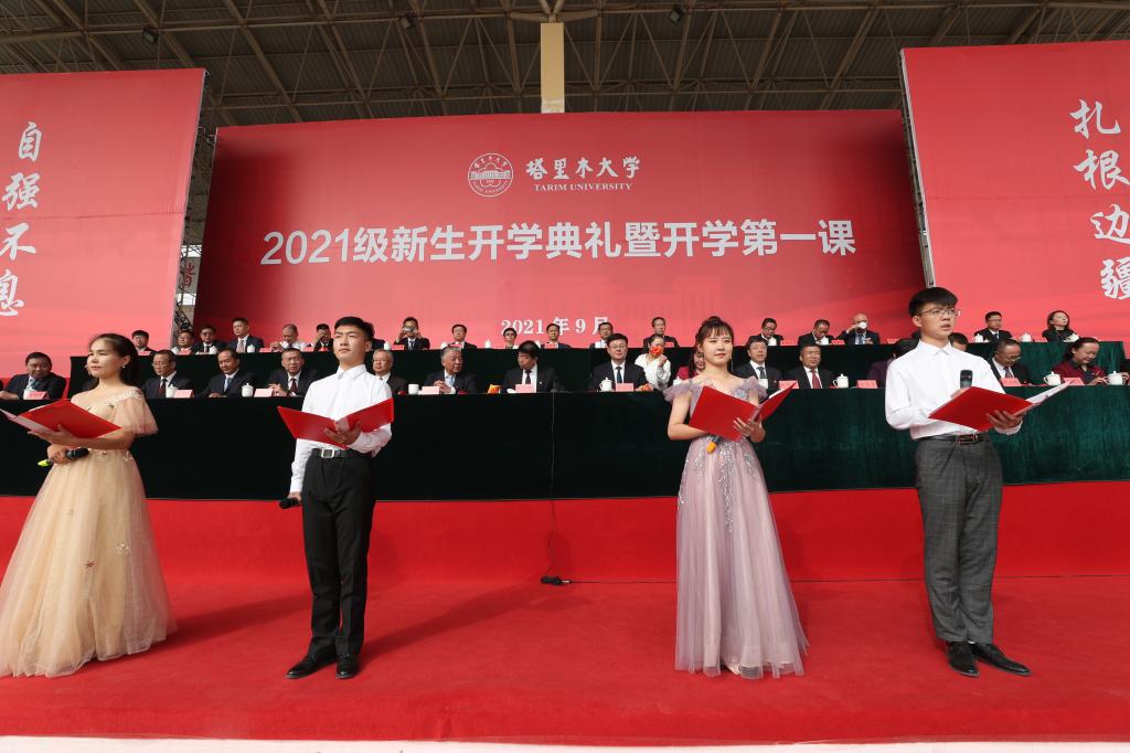伴随着校歌《光荣塔大》,各学院学生代表走在排头,高举旗帜,迎风飘扬。校领导为新生代表佩戴校徽,学生代表献词《我的名字叫胡杨》。