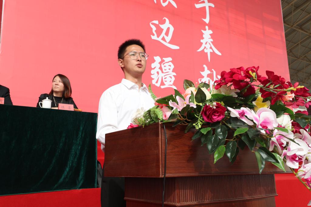 在校生代表、兵团学联驻会主席、校学生会主席成员、水产养殖学2018级常德胜发言,代表塔大的学长学姐们向各位“小胡杨”的到来表示最热烈的欢迎,希望学弟学妹们要破茧成蝶,遇见“蜕变”;上下求索,遇见“历练”;奋斗青春,遇见“成长”;不忘初心跟党走,牢记使命勇担当。