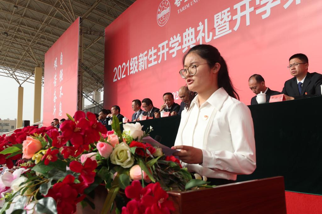 新生代表、医学院临床2021级2班本科新生徐崇俊发言,并带领全体2021级新生宣誓。他说,来自五湖四海的我们,正如一颗颗怀揣着梦想的小胡杨,相信在塔大红色基因的铸就下,我们每一颗小胡杨都能迎风招展,成为兴疆固边的新时代戍边人。要只争朝夕,不负韶华,奋勇向前,以昂扬姿态刻苦学习,历练本领,服务社会。