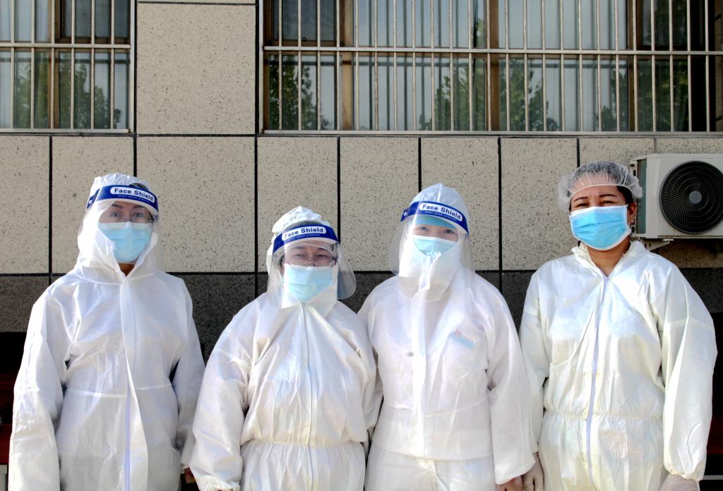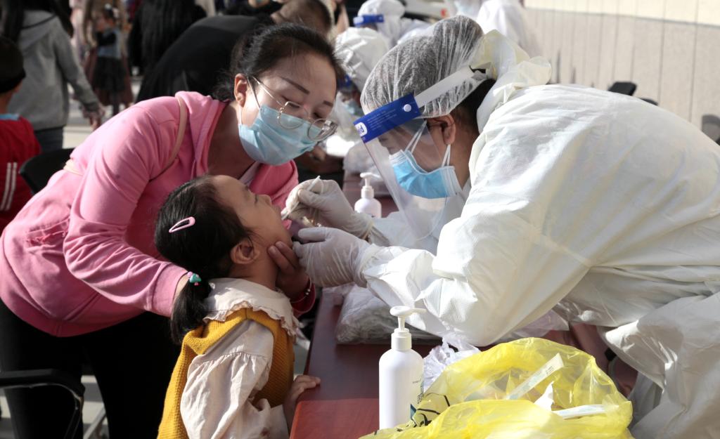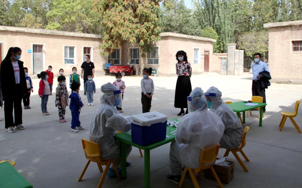 刘咏君、姬亚娟、再娜甫·依米提、赵丽娜等医护人员耐心负责地为幼儿进行核酸检测采样。(文/冯婷婷 李芳 摄/李芳)