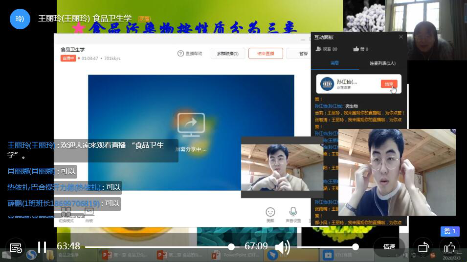 食安21-2范艺和苟媛娥说:“通过直播课,我们可以直接和老师互动,老师也能够随堂提问,点燃了我们学习热情,同时也使我们更加珍惜来之不易的学习机会,感谢学校和老师让我在家也能学习到知识。”