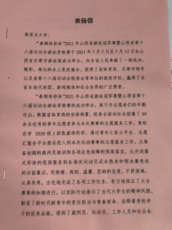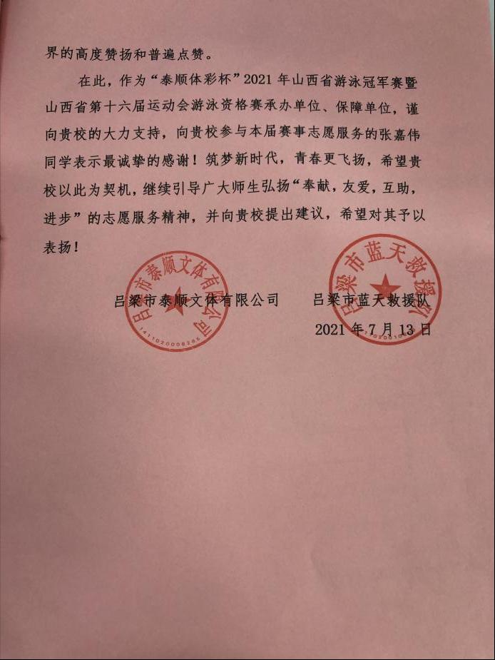 近日,我校收到了来自吕梁市泰顺文体有限公司、吕梁市蓝天救援队发来的一封表扬信;表扬信对我校农学2020级张嘉伟同学勇于担当,无私奉献的精神给予高度肯定并提出表扬。