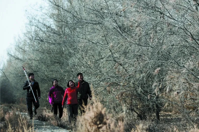 塔里木大学生命科学学院教授李志军(右二)在学校附近的实验林里,带学生查看胡杨的生长情况(资料图片)。石榴云/新疆日报记者谢龙摄