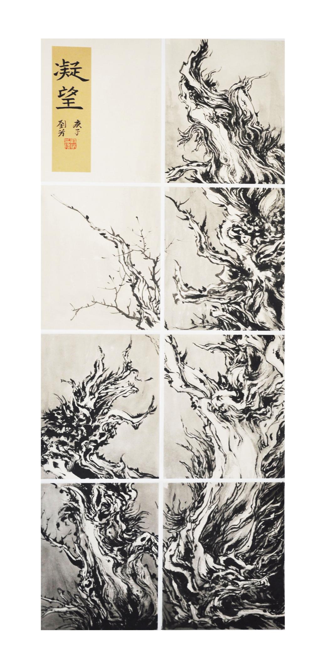 刘芳老师一直坚持艺术创作,近年来多次参加各级各类展览,其作品深受专家好评,此次参展作品《生的渴望》、《凝望》,以塔克拉玛干沙漠的胡杨为题材进行创作,表现“大漠胡杨·民族之魂”。15年前,她有幸来到塔里木大学工作,在塔克拉玛干与大漠胡杨不期而遇,为它的魅力、雄健、神奇、壮美,为它的生命张力和灵魂呼喊所震撼,从此结下不解画缘。她秉承“师法造化”的理念,15年来上百次踏入大漠深处,探寻胡杨。年复一年的心灵对话、情感交流使,他与胡杨结为莫逆。无以计数的写生草稿,化为她笔下千姿百态、生机勃勃的水墨胡杨,让人们认识胡杨之奇,欣赏胡杨之美,领悟胡杨之魂,从中汲取战胜一切挑战,励志复兴中华的精神力量。
