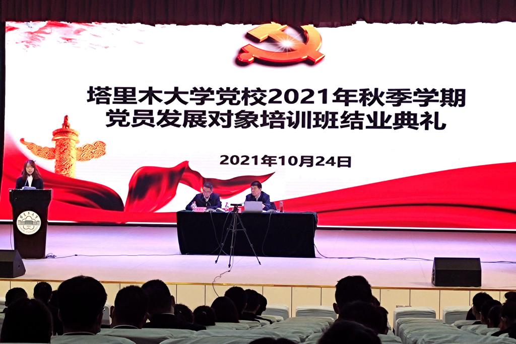 10月24日,塔里木大学党校2021年秋季党员发展对象培训班结业典礼在大学生活动中心举行。党委书记赵光辉出席并讲话。相关部门领导、干部代表、全体党训班学员共同参加。典礼由党委宣传部部长王志刚主持,采取线下+线上方式举行。主会场设在大学生活动中心,分会场设在综合楼各教室。