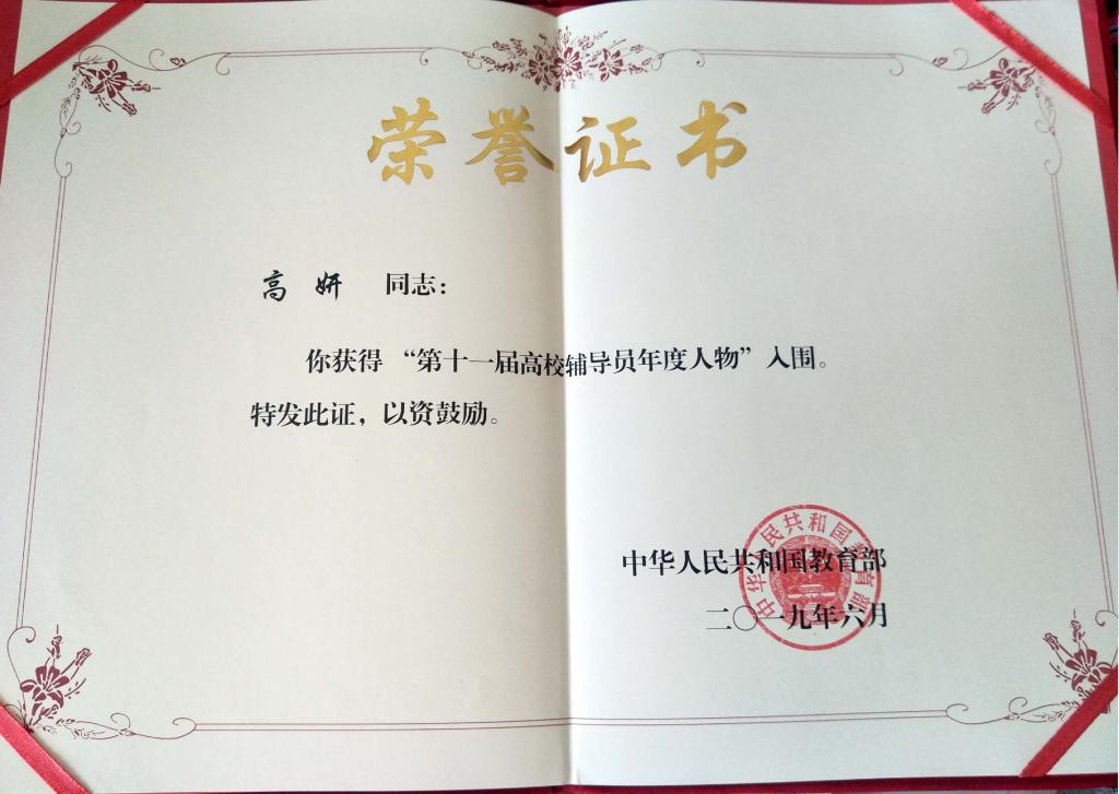 2019年第十一届全国高校辅导员年度人物评选活动落下帷幕,我校辅导员高妍荣获“全国高校辅导员年度人物入围奖”,这也是我校第二次在该项评比中获奖。