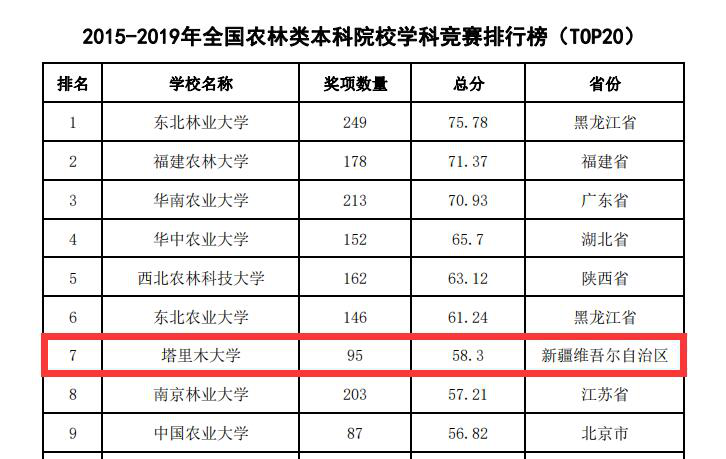 2月22日,中国高等教育学会《高校竞赛评估与管理体系研究》专家工作组发布2015-2019年和2019年全国普通高校学科竞赛排行结果。本次共发布了12个本科院校榜单、11个高职院校榜单和2个省份榜单2个。我校在2015-2019年全国普通高校学科竞赛排行榜(本科,TOP300)榜单中,以获得95项奖项、总分58.3分的成绩,位列全国第203位;在“2015-2019年全国农林类本科院校学科竞赛排行榜(TOP20)”位列第7位,这是继“2014-2018年农林医药本科院校学科竞赛排行结果(本科)TOP20”榜单中取得第11位好成绩基础上的新突破。