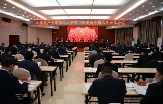 1月16日上午,伴随着雄壮的奏唱国歌声,中国共产党塔里木大学第二届委员会第六次全体会议在南疆双语培训中心二楼会议厅开幕。