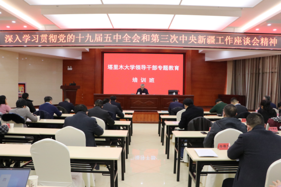 1月11日下午,党委常委、副校长曲义勇为学校深入学习贯彻党的十九届五中全会和第三次中央新疆工作座谈会精神领导干部专题教育培训班作讲座。讲座在南疆双语中心二楼报告厅举行。