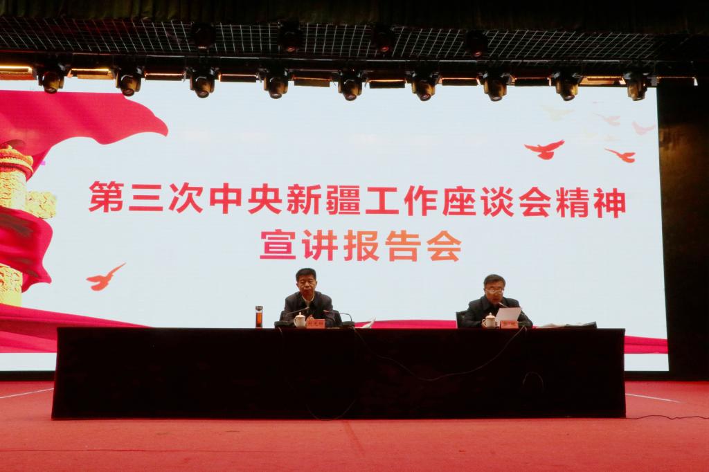11月18日下午,党委书记赵光辉为人文院党员干部和师生宣讲第三次中央新疆工作座谈会精神。宣讲报告会由人文院党委书记张理主持,在行政楼报告厅举行。
