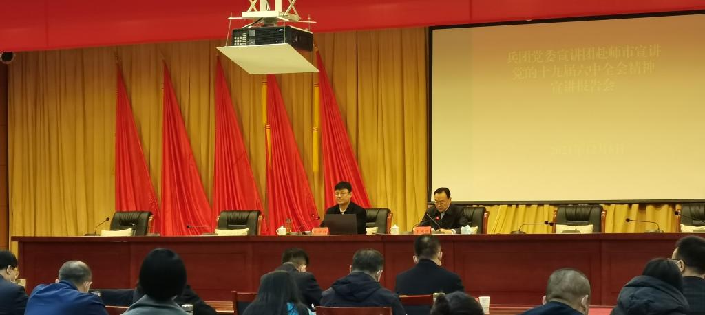 12月6日上午,根据兵团党委统一部署,兵团党委学习贯彻党的十九届六中全会精神宣讲团成员、我校党委副书记、校长张传辉赴兵团第十师北屯市开展党的十九届六中全会精神宣讲。师市领导班子成员、人大政协主要负责同志、法院、检察分院、师市机关部门、师市直属企事业单位的主要负责同志、各团场领导班子成员、离退休干部,党委党校骨干教师,及中学生代表聆听了报告会。