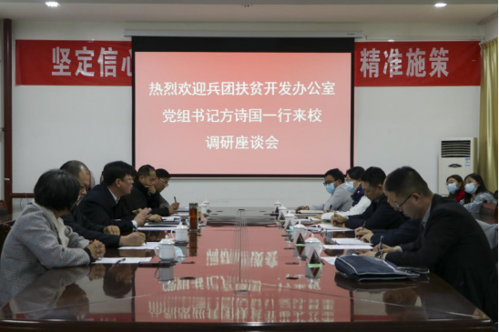 3月21日上午,兵团扶贫开发办公室党组书记方诗国一行来校调研并召开座谈会。党委副书记、校长张传辉,副校长张利莉出席。兵团有关部门、学校相关部门、学院负责同志参加。座谈会由张利莉主持,在行政楼317会议室召开。
