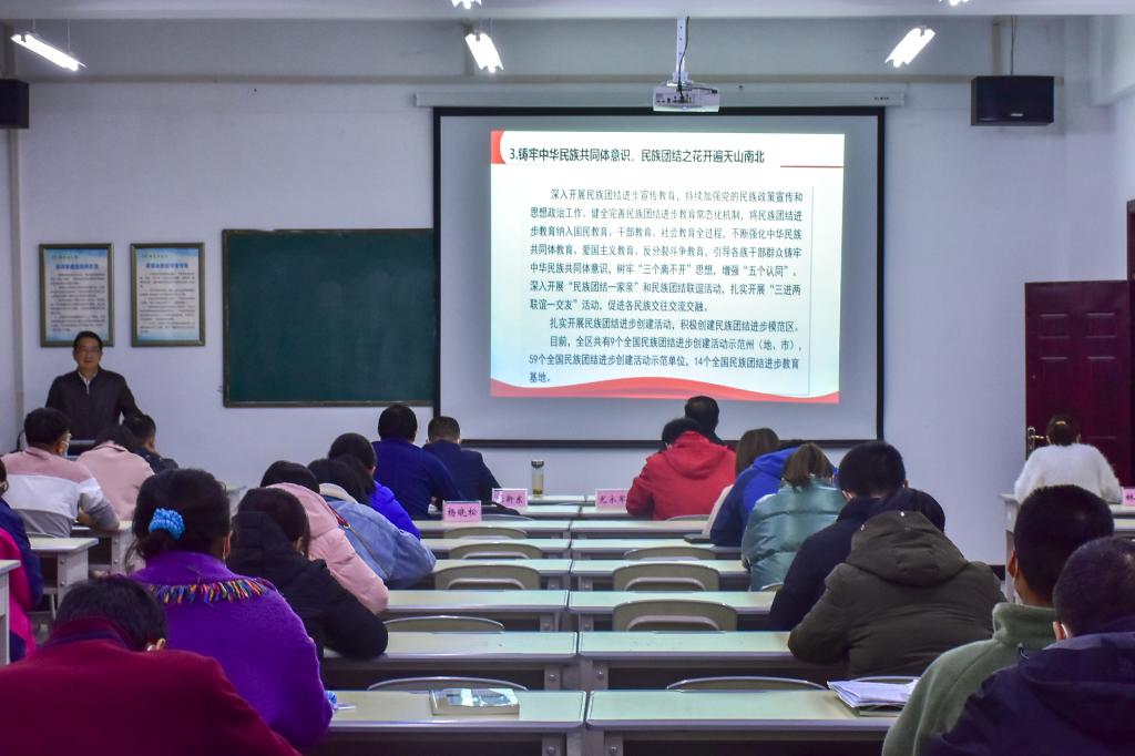 11月20日晚,党委宣传部部长王志刚为水利与建筑工程学院教师宣讲第三次中央新疆工作座谈会精神。宣讲报告会由学院党委副书记李新主持,在工科实训楼南513教室举行,全院教职工倾听了报告。