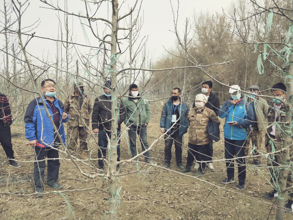 针对梨树如何修剪、如何施肥、灌水、防止病虫害等问题,六连支部和工作队邀请张琦教授为农户解决这些难题。作为多年从事一线林果业教学实践的老教师,张琦教授始终牵挂着农户和农业生产。听说农户家的梨树管理遇到了问题,他立即赶到生产一线进行技术指导。张琦一下车就直奔主干形香梨示范基地,拿着剪枝剪,手把手,教农户学习掌握香梨主干形冬春修剪、落头、控高、拉枝方法、高位嫁接和人工授粉等种植管理技术。