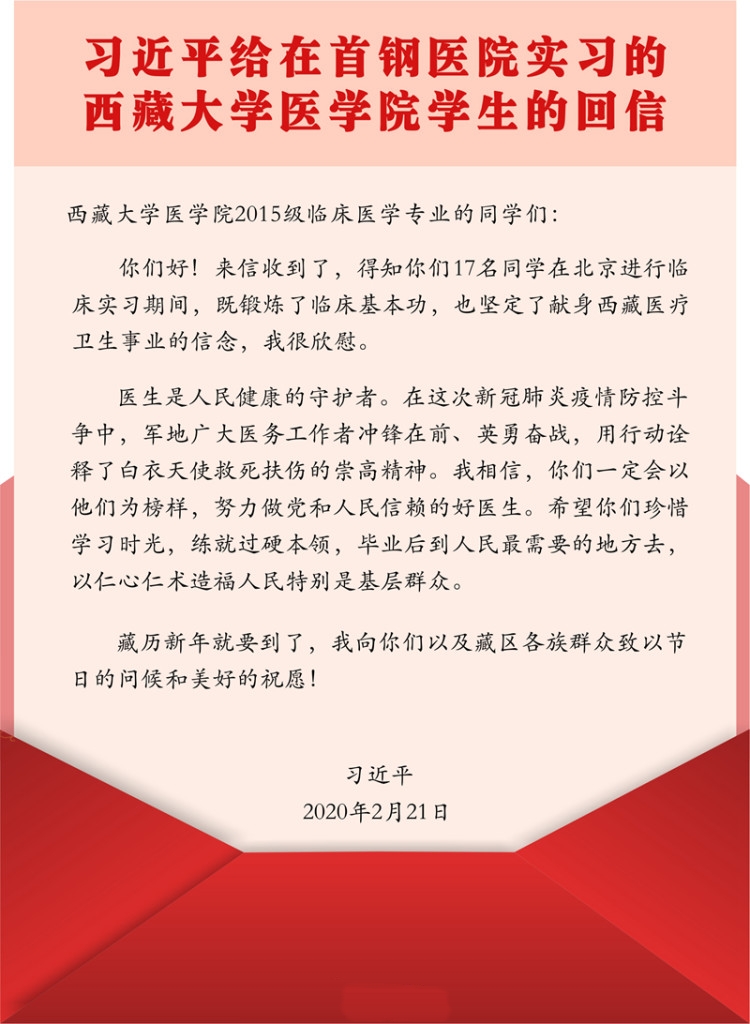 在藏历新年来临之际,中共中央总书记、国家主席、中央军委主席习近平2月21日给正在北京大学首钢医院实习的西藏大学医学院学生回信,肯定他们献身西藏医疗卫生事业的志向,勉励他们练就过硬本领、服务基层人民,并向他们以及藏区各族群众致以节日的问候和美好的祝愿。