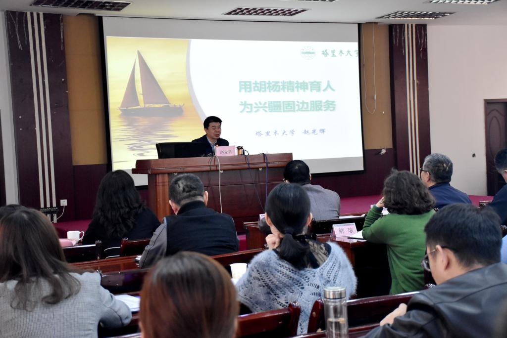赵光辉作了“用胡杨精神育人 为兴疆固边服务”的主题报告。介绍了学校概况以及以“屯垦育才六十载薪火相传遍天山”为主题的庆祝建校60周年系列活动开展情况。回顾了塔大60年来,初心不改,用胡杨精神育人、为兴疆固边服务,培养了一批批扎根边疆、献身边疆的有用人才,用生动的实践回答了培养什么人、怎样培养人、为谁培养人这一根本问题。