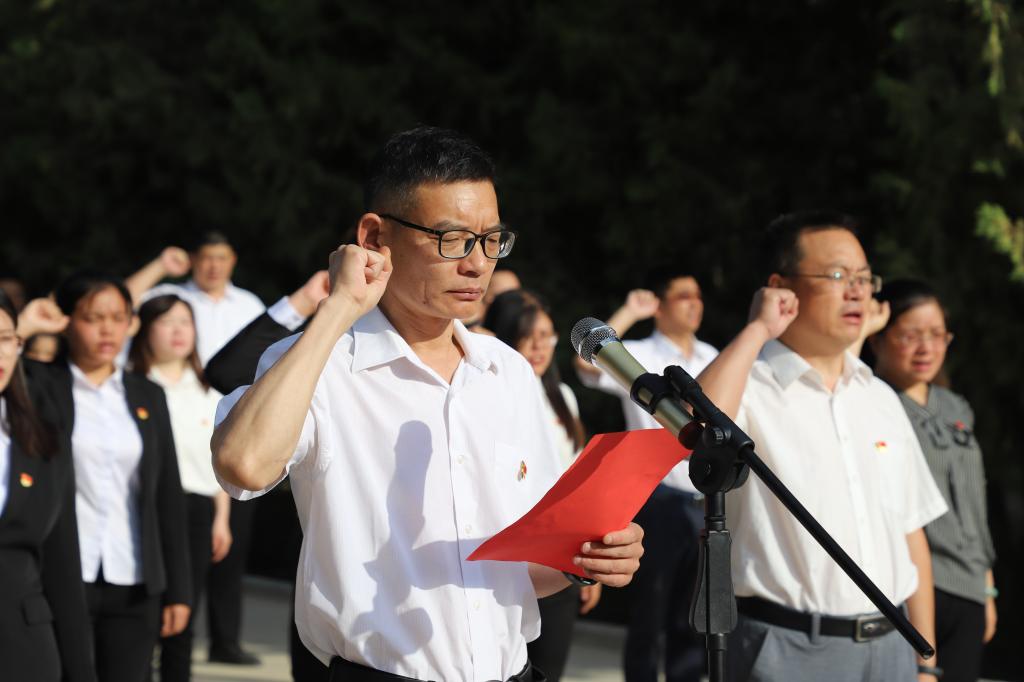 6月30日上午,经管院在红色文化广场办了“新党员入党宣誓暨老党员重温入党誓词”主题党日活动。学院党委书记田国林、党委副书记谷建杰、党委委员朱哲,以及全体在校师生党员参加。在鲜红的党旗下,学院领导及学生党支部书记为新党员佩戴党员徽章,田国林带领全体党员面向党旗,举起右手,握紧右拳,庄严宣誓。铿锵有力的誓言激荡着每位共产党员的心,在党旗下接受心灵的净化和洗礼。