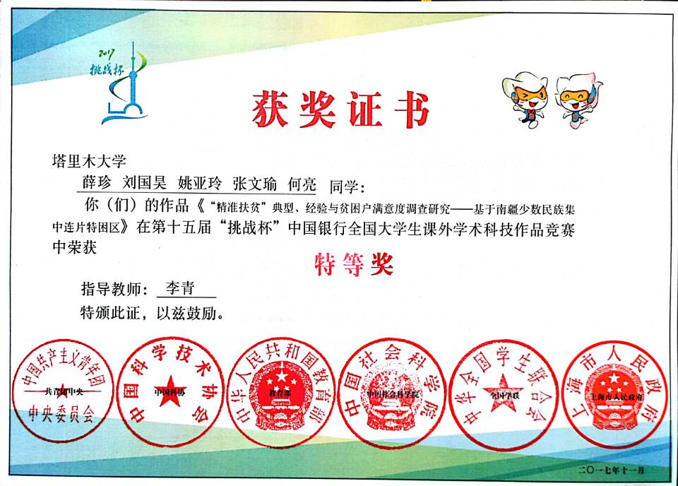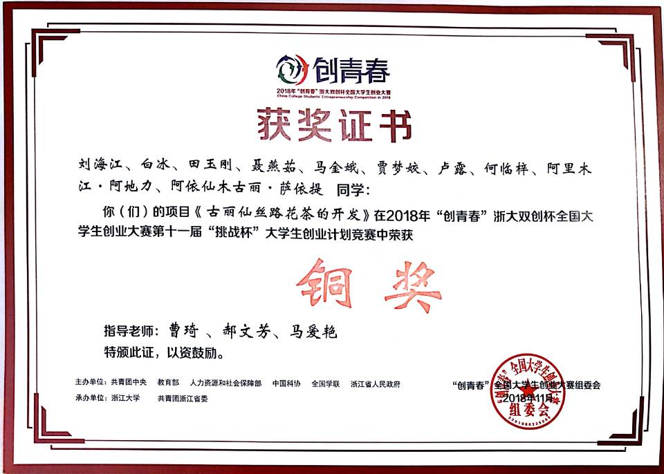 以创新创业教育为统领,学校形成了以“互联网+”、“挑战杯”和“创青春”竞赛为龙头,各类学科竞赛为支撑,学生科研为基础,科技社团为载体,创新创业学分为激励,社会实践活动为补充的大学生课外创新创业活动体系;以学院为单位开展品牌学科竞赛活动,以赛促教,提升学生创新创业能力。获得国家级奖项215项,省部级奖项462项。获十六届“挑战杯”全国大学生课外科技作品竞赛国家级二等奖1项,三等奖3项,成绩排名全疆高校第一,《返贫抑制:基于南疆深度贫困区精准脱贫与乡村振兴协同推进模式调查及效果满意度评价》获“挑战杯”累进创新作品银奖。我校成功举办在第六届兵团互联网+大学生创新创业大赛,并获得兵团一等奖4项、二等奖2项、三等奖13项、最具创意奖1项、精准扶贫奖1项、逐梦小康奖1项,其中《凝“核”聚力—— 扶贫成效再提升》团队首次入围全国决赛,并在全国总决赛中斩获银奖,实现历史性突破。《披“沙”拣金,惠享万家基于绿色环保的生态种植模式》、《日光温室水幕地暖加温设备》入围第十二届“挑战杯”中国大学生创业计划竞赛全国总决赛。在2015-2019年全国普通高校学科竞赛排行榜(本科,TOP300)榜单中,以获得95项奖项、总分58.3分的成绩,位列全国第203位;在“2015-2019年全国农林类本科院校学科竞赛排行榜(TOP20)”位列第7位,这是继“2014-2018年农林医药本科院校学科竞赛排行结果(本科)TOP20”榜单中取得第11位好成绩基础上的新突破。