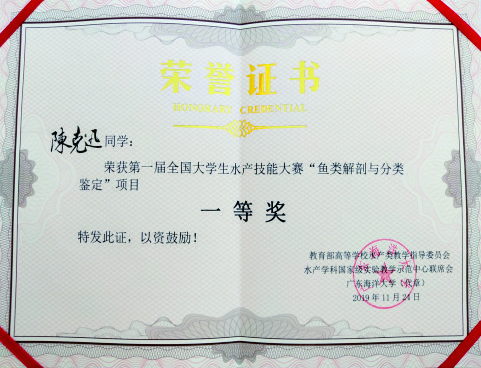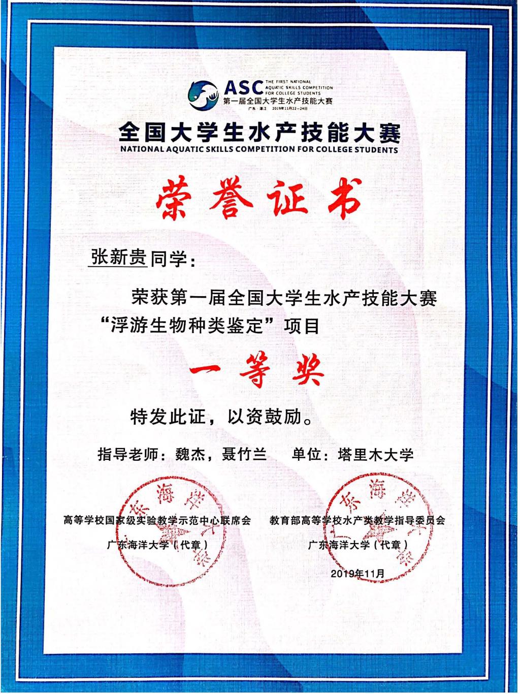2019年我校学生获得第一届全国大学生水产技能大赛“浮游生物种类鉴定”项目一等奖。