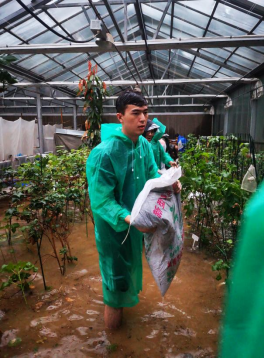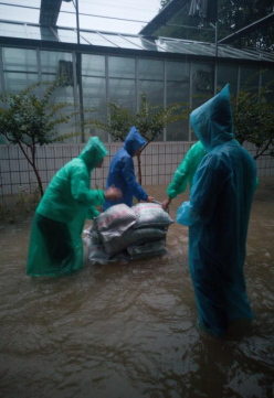 凌晨5点天色还昏暗,加上风雨交加,乌云密布,室外昏暗无比。刚从被窝出来的我们就踏进过膝盖的雨水中,不禁打了个寒颤。但是我们深知前线面临着险情,便毅然决然的前往最需要我们的地方,听从指挥,行动迅速,用肩抗,用车拉,修筑起了防洪沙袋墙。从凌晨5点一直坚持到了上午10时许。在这途中我们走过齐腰深的洪水;踏过深浅不一的淤泥;抗过几十斤的沙袋;抬过几百斤的仪器。最后在同学和教职工的不懈努力下,我们筑起了抗洪防线,保护好了中棉所的财产。