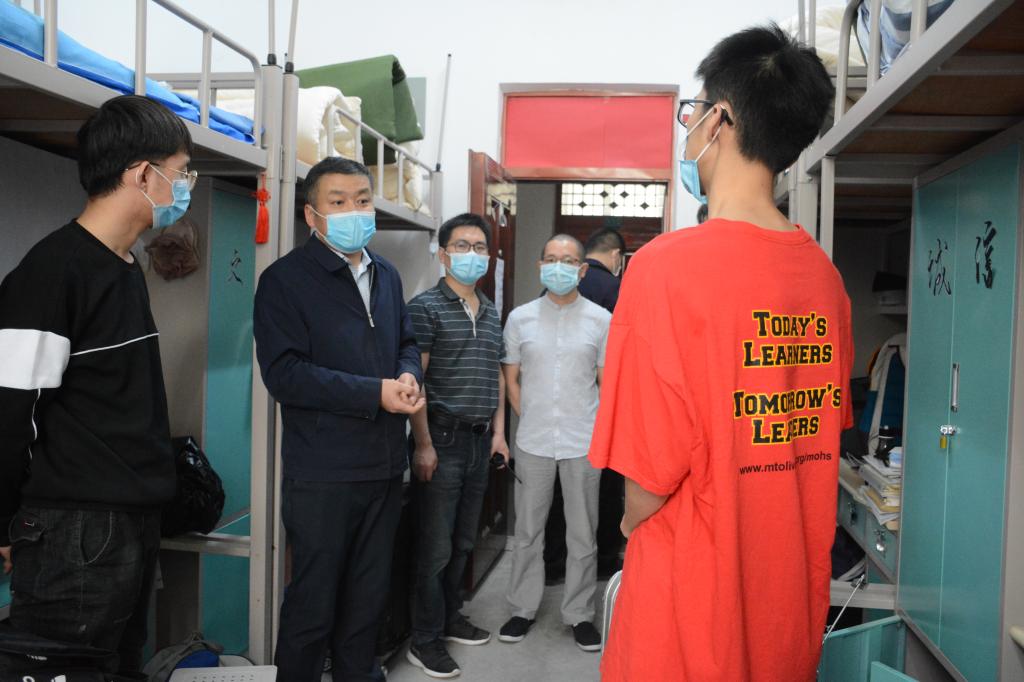 5月7日下午,党委书记赵光辉,党委副书记、校长张传辉,党委副书记、纪委书记单洪山,党委副书记张爱萍,党委常委、副校长卢光志,副校长张利莉,党委常委、副校长曲义勇、于军、石长青,校长助理钱令波,分组深入各学院、来到各宿舍楼、食堂、市场等处,检查指导返校返学和疫情防控工作,亲切走访看望返校学生和教职工、安保人员、医护人员、保洁人员等一线工作人员。