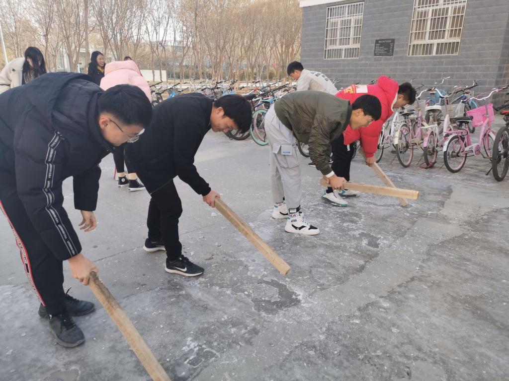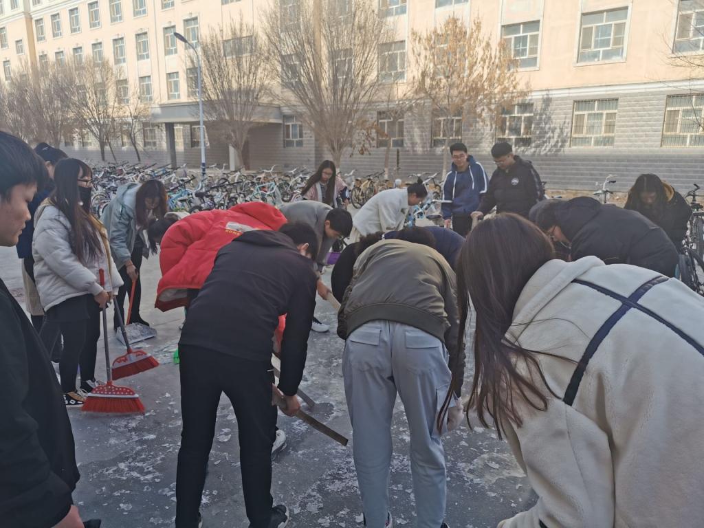 天气寒冷,造成地面结冰,给师生出行造成不便。支部党员拿起扫帚、铁锹等工具,不畏严寒,铲的铲、扫的扫,一铲一扫地把碎冰清到道路两旁。热情似火、干劲十足,经过一个多小时的努力,路面恢复了整洁,看着行人和车辆不再打滑,大家脸上露出了开心的笑容。