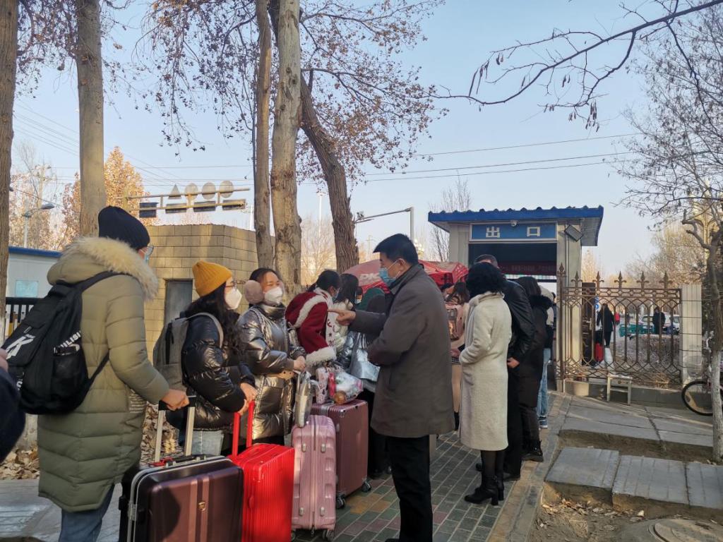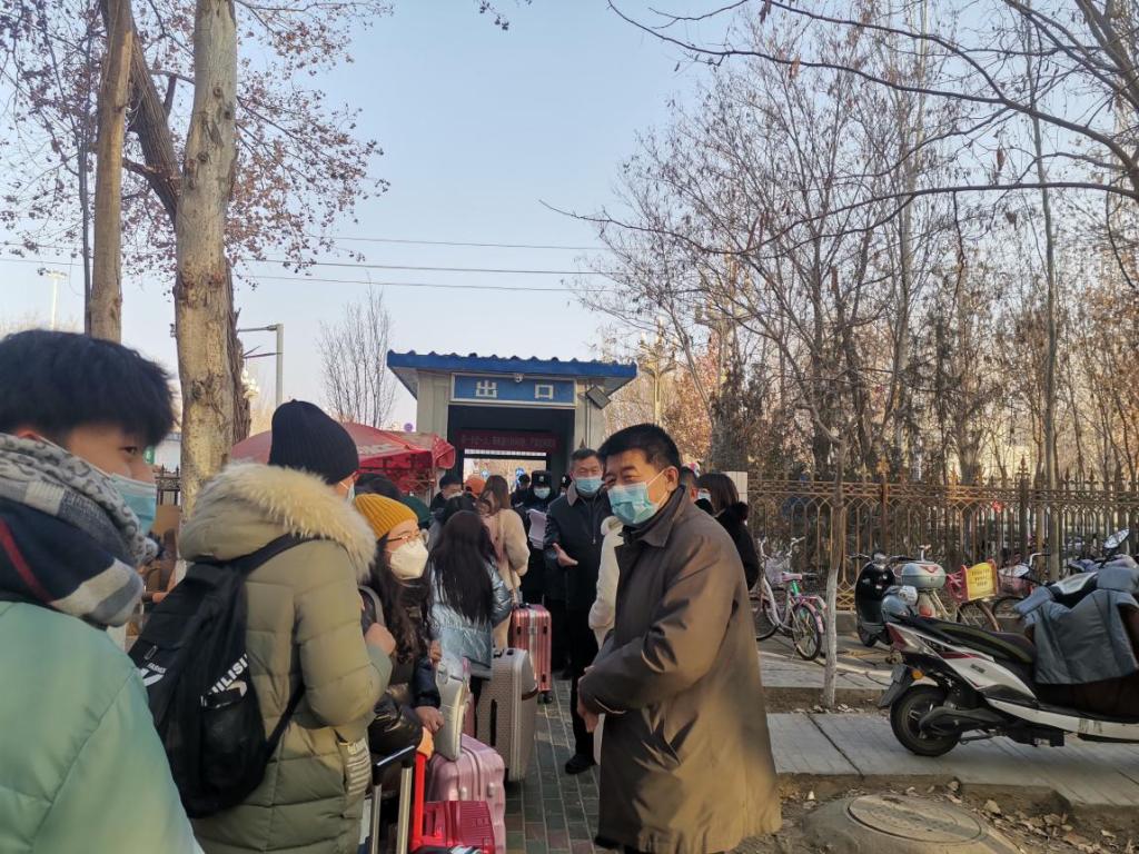元旦之际,部分学生考完试陆续离开校园,踏上了回家的路途。1月2日上午,党委书记赵光辉,党委副书记张爱萍,党委常委、副校长于军,来到学校北门欢送即将离校回家的学生,与同学们亲切交谈。