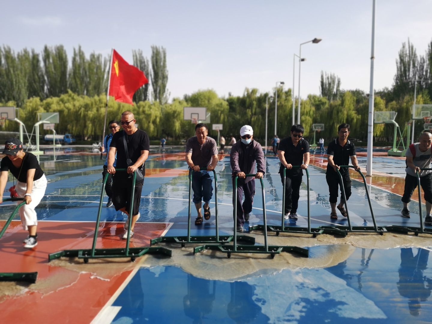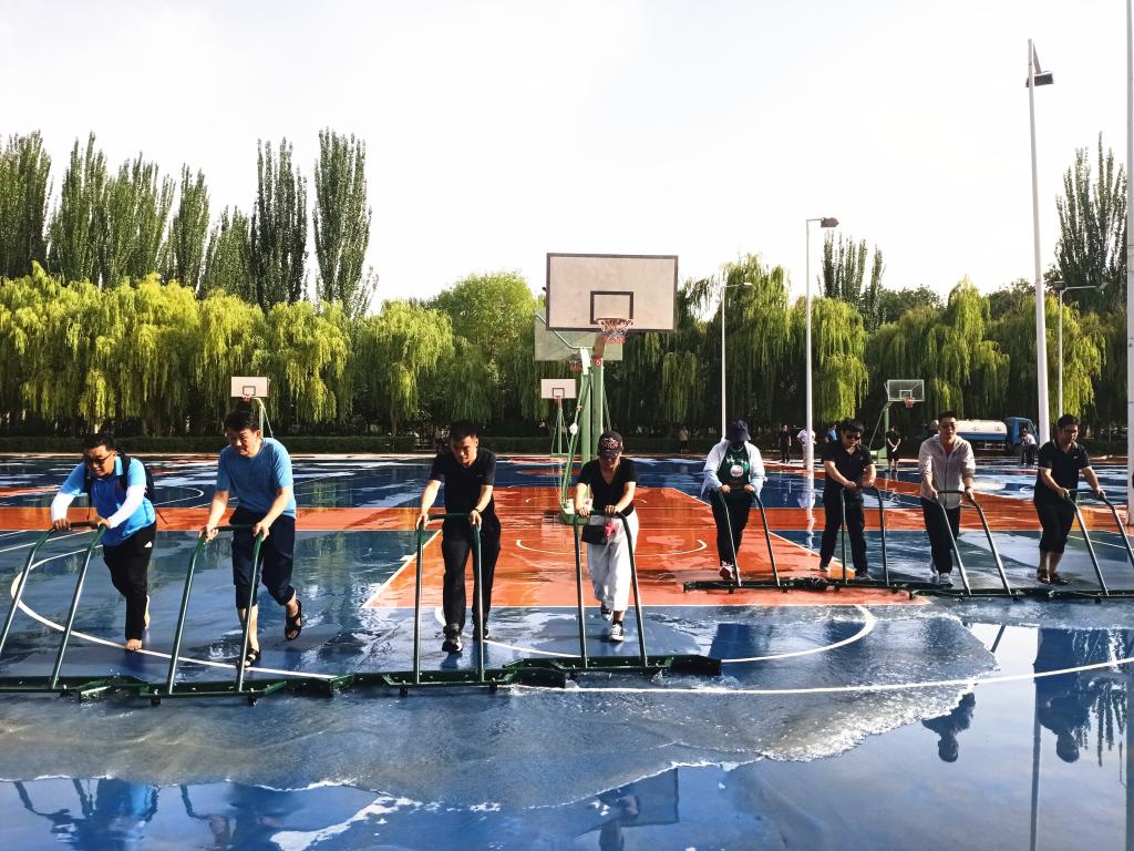 随着一声“排好队,开始!”号令的发出,所有的党员便投入到球场清洁劳动中去了。脏水湿透了鞋子、泥浆沾满了裤腿、汗水淌下了脸颊,党员们的热情却丝毫未减,一遍又一遍将混杂着泥土的污水排出场地,球场终于露出了漂亮的蓝色。望着焕然一新的场地,每一位党员同志的脸上都洋溢着开心的笑容。后勤管理处党总支书记杨建军和体育工作部直属党支部书记梁国杰表示,通过本次主题党日活动,加深了两个部门之间的交流与合作,发挥了基层党组织战斗堡垒作用,提升了党组织的凝聚力,以实际行动向党的生日献礼。后期我们还要继续加强沟通合作,为师生员工提供更多更好的服务。