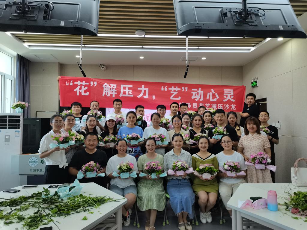 辅导员李丹丹介绍了开展此次沙龙的意义;人文学院辅导员吴垠带领大家做了放松训练;插花过程中,花艺师为大家科普了花艺选材、护理等方面的知识,对插花步骤进行详细教学,指导大家完成各自的作品,大家细心地聆听着每一个步骤,通过轻松的插花花艺释放工作压力,展示对生活的美好向往。